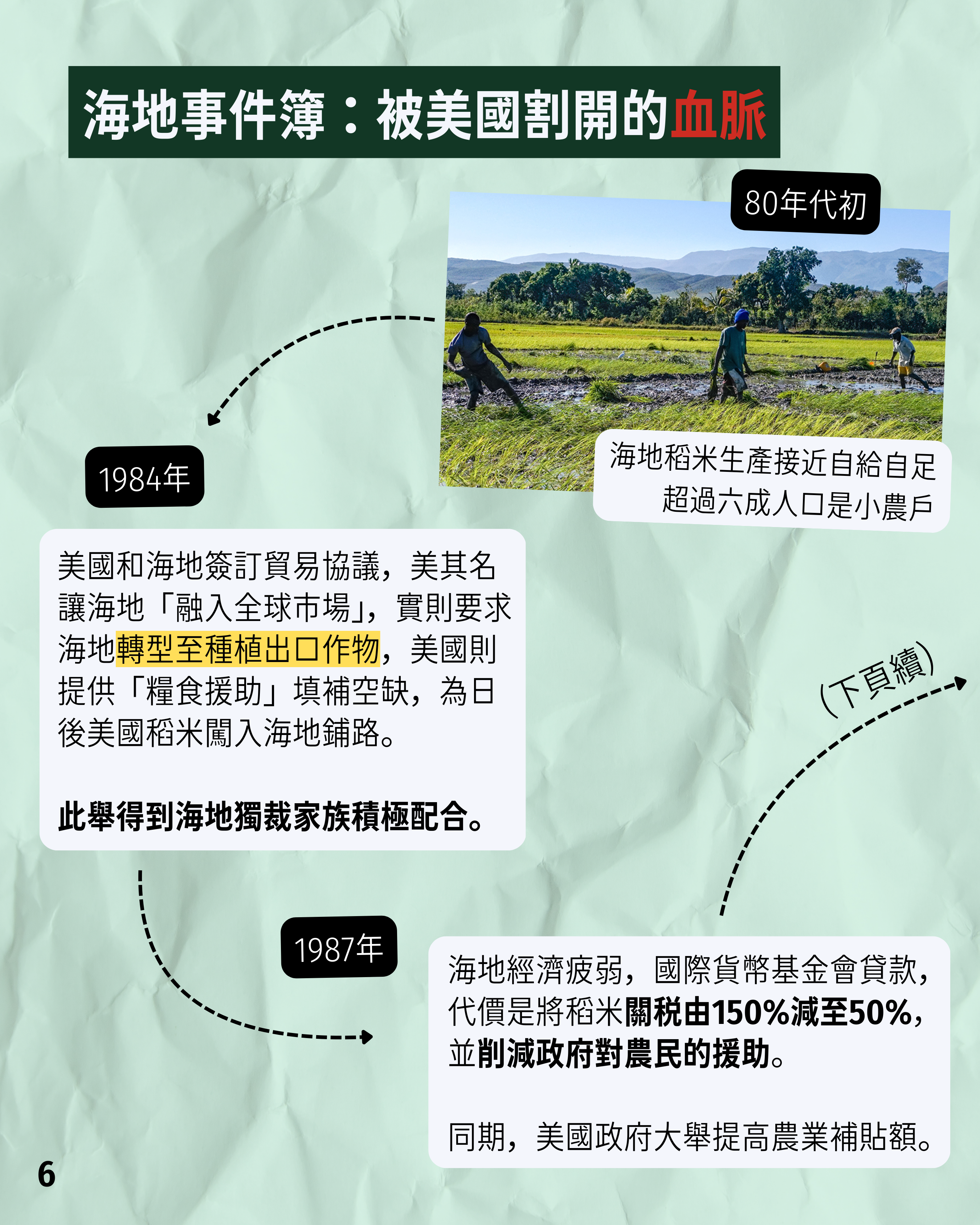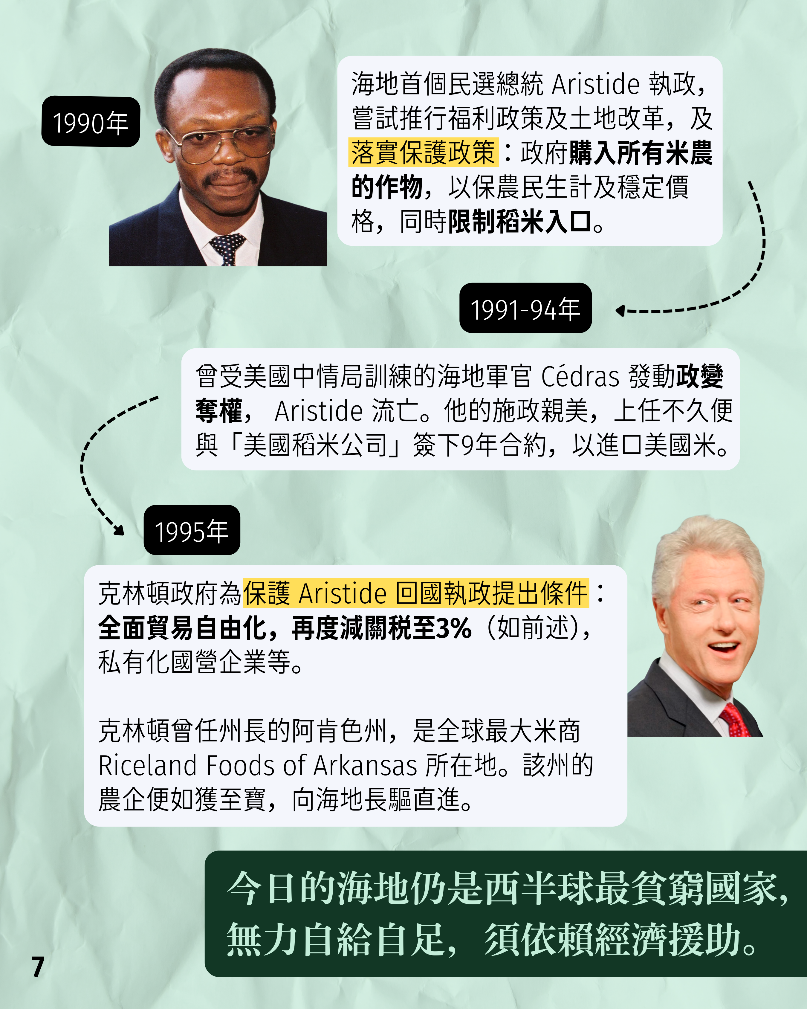 產能過剩導致國內市場飽和,富國政府便以低廉價格傾銷出口解決囤積食糧,發展中國家小農的本地作物在市場上難以與美國補助出口的作物競爭。樂施會早年就稻米貿易作詳細分析,如1995年國際貨幣基金組織與美國強行推開海地關口,使海地將稻米關稅從35%降至3%,美國稻米得以傾銷入海地,對當地造成多方面的打擊。一來,美國稻米一下子湧入市場,排擠本已進入市場的本地稻米,造成糧食浪費。二來,本地小農不敵美國以本傷人,無法出售作物,只能賠上種植開支成本,眼睜睜看着農田上的稻米腐壞損耗。長遠而言,不但當地米農需減產止蝕,發展中國家的農業亦會面臨萎縮,令小農的生活更為艱難。富國保護政策鼓吹農民過量生產,2019年美國便有8,060萬噸未出售、未食用的食品遭丟棄;糧食供過於求繼而又傾銷出口,大國聯同農企操控糧食價格,不公平貿易下窮國農民難以靠務農脫貧,使糧食公義面臨巨大挑戰。